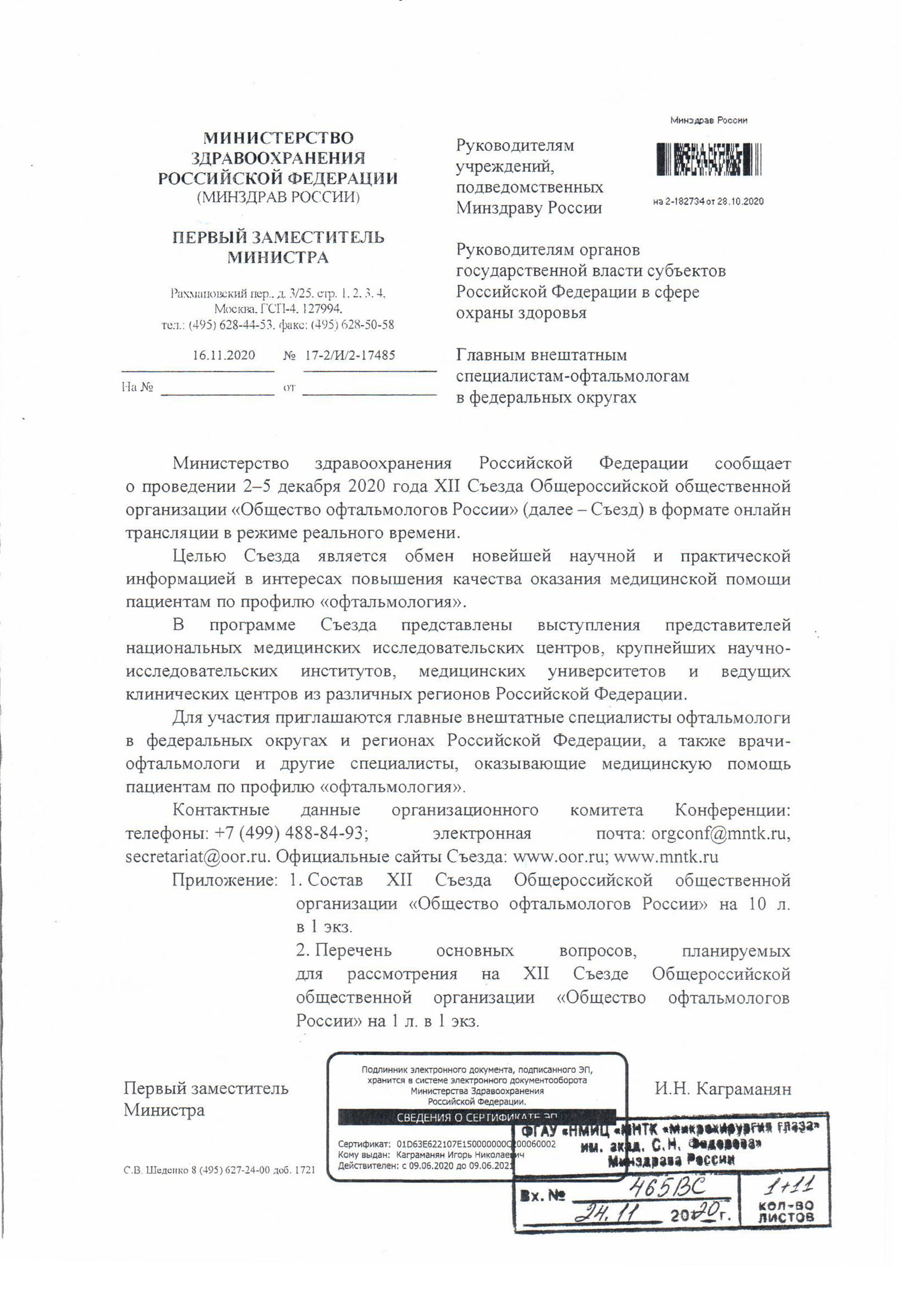 Министерства здравоохранения Российской Федерации о проведении XII Съезда Общества Офтальмологов России.