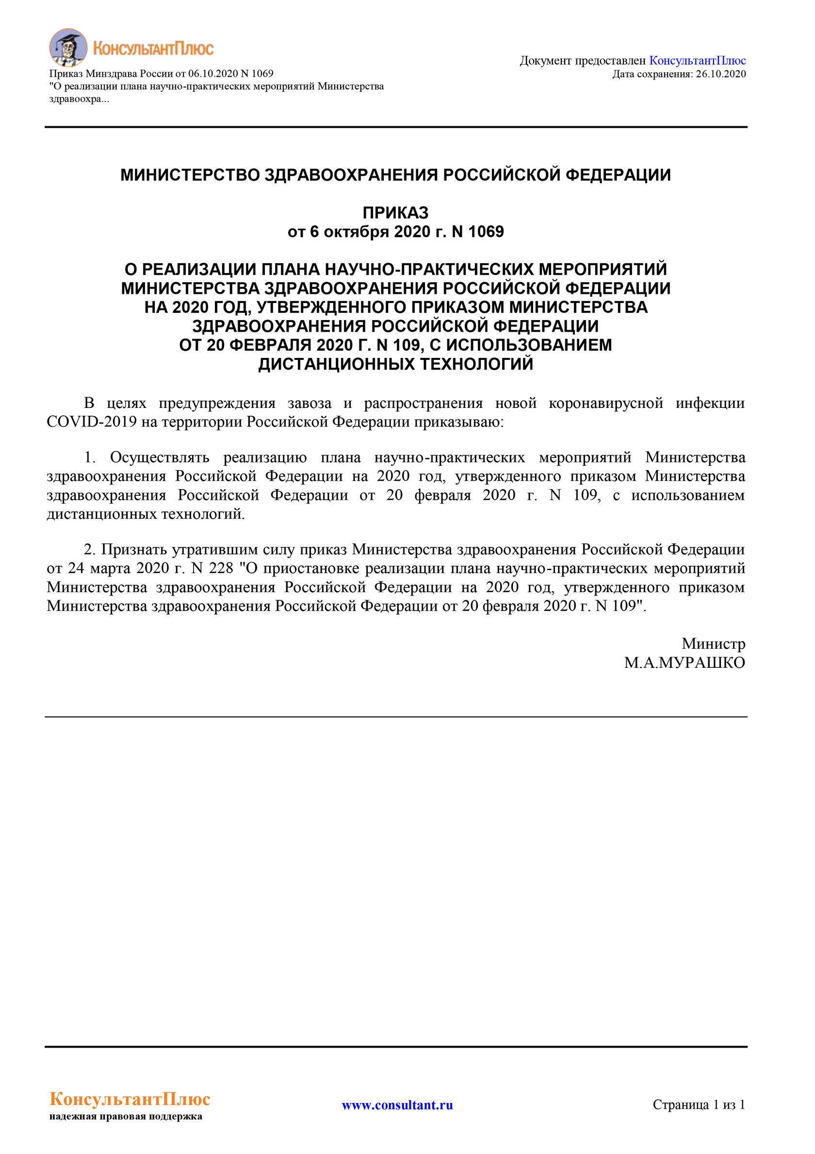 О реализации плана научно-практических мероприятий Министерства здравоохранения Российской Федерации на 2020 год, утвержденного приказом министерства Здравоохранения Российской Федерации от 20 февраля 2020 г. N 109, с использованием дистанционных технологий.